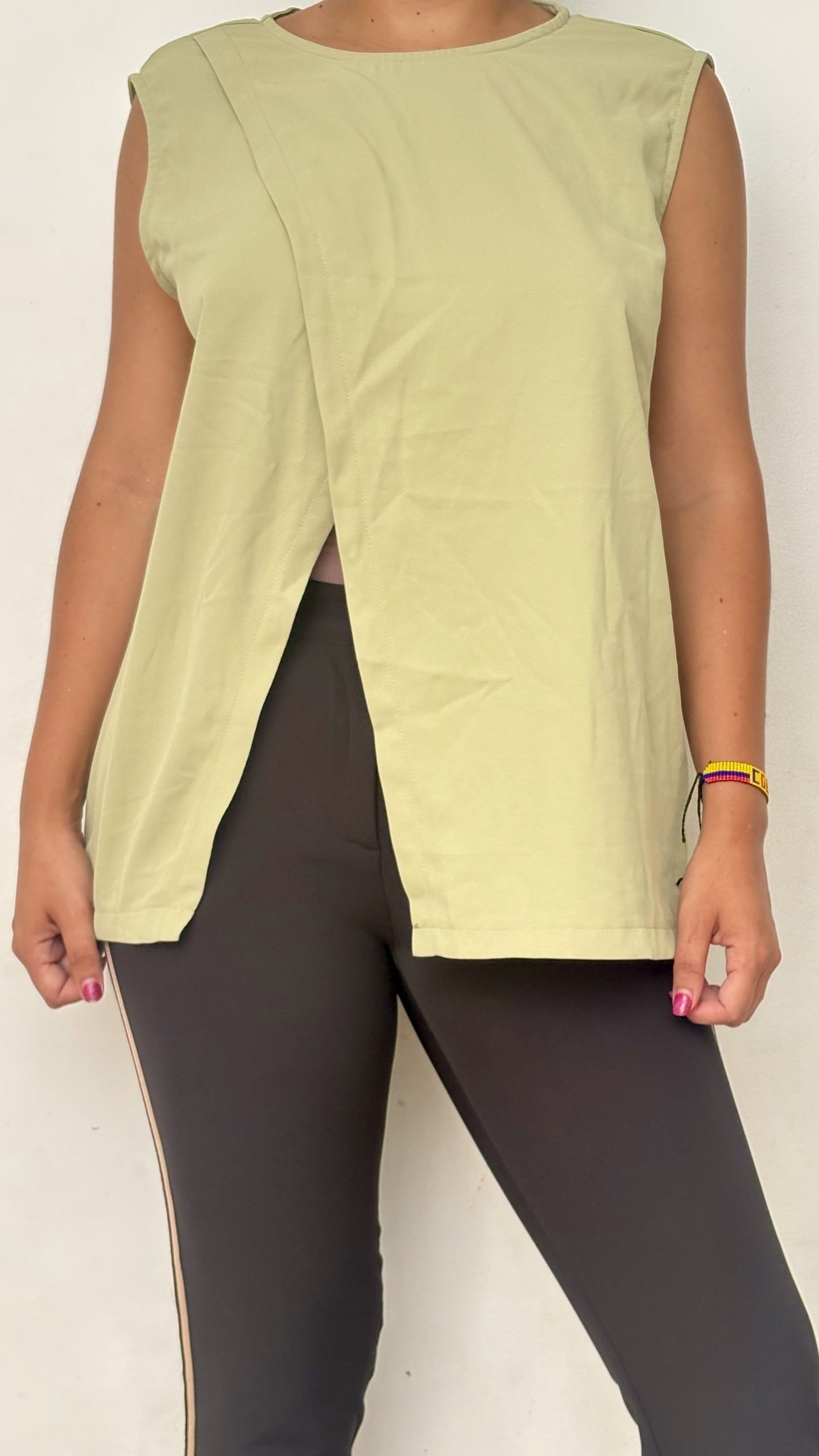 Sofisticada y moderna, esta blusa en tono verde es la opción ideal para un look elegante y versátil. Su corte asimétrico en la parte delantera añade un toque de originalidad y fluidez, perfecto para destacar en cualquier ocasión. Confeccionada en una tela ligera y cómoda, es ideal para combinar con pantalones de vestir o faldas y crear un outfit impecable.