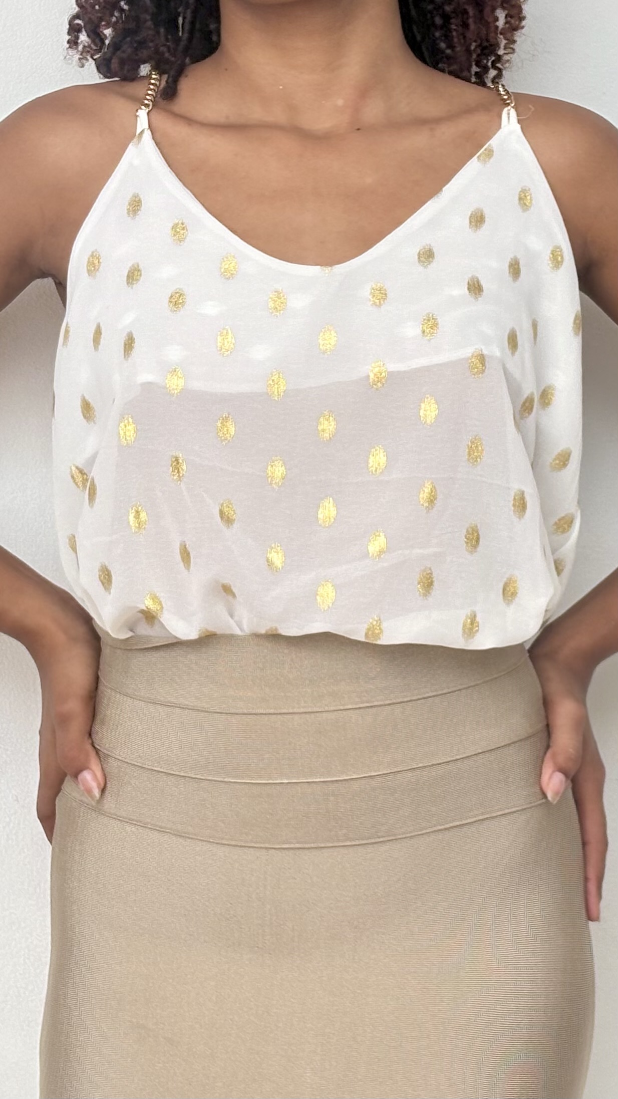 Elegante y sofisticada, esta blusa transparente en tono blanco está adornada con sutiles puntos dorados que le aportan un toque de brillo y glamour. Sus tiras en forma de cadena dorada añaden un detalle distintivo y moderno. Ideal para combinar con faldas, pantalones de vestir o jeans y lograr un look chic y refinado.