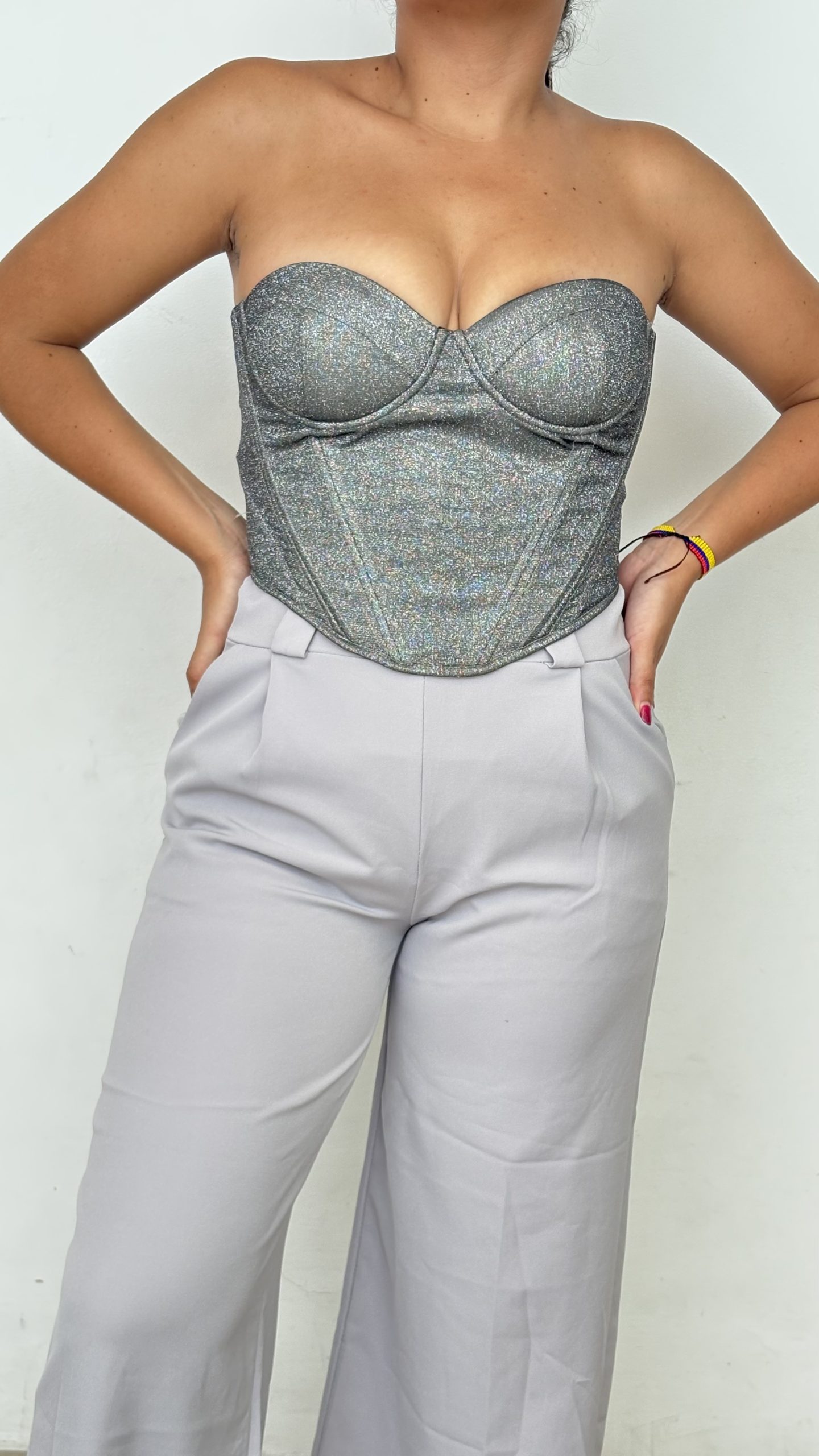 Atrévete a brillar con este espectacular corset plateado, perfecto para darle un toque de glamour a cualquier outfit. Su diseño estructurado realza la figura, proporcionando un ajuste favorecedor y elegante. Ideal para combinar con jeans, faldas o pantalones de cuero y crear looks impactantes para salidas nocturnas o eventos especiales.