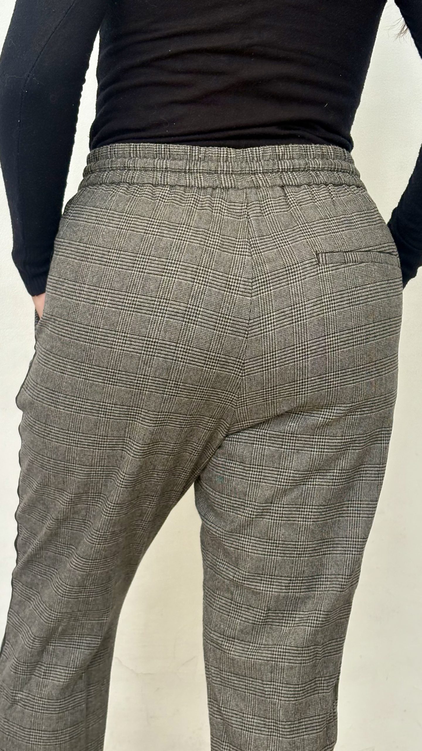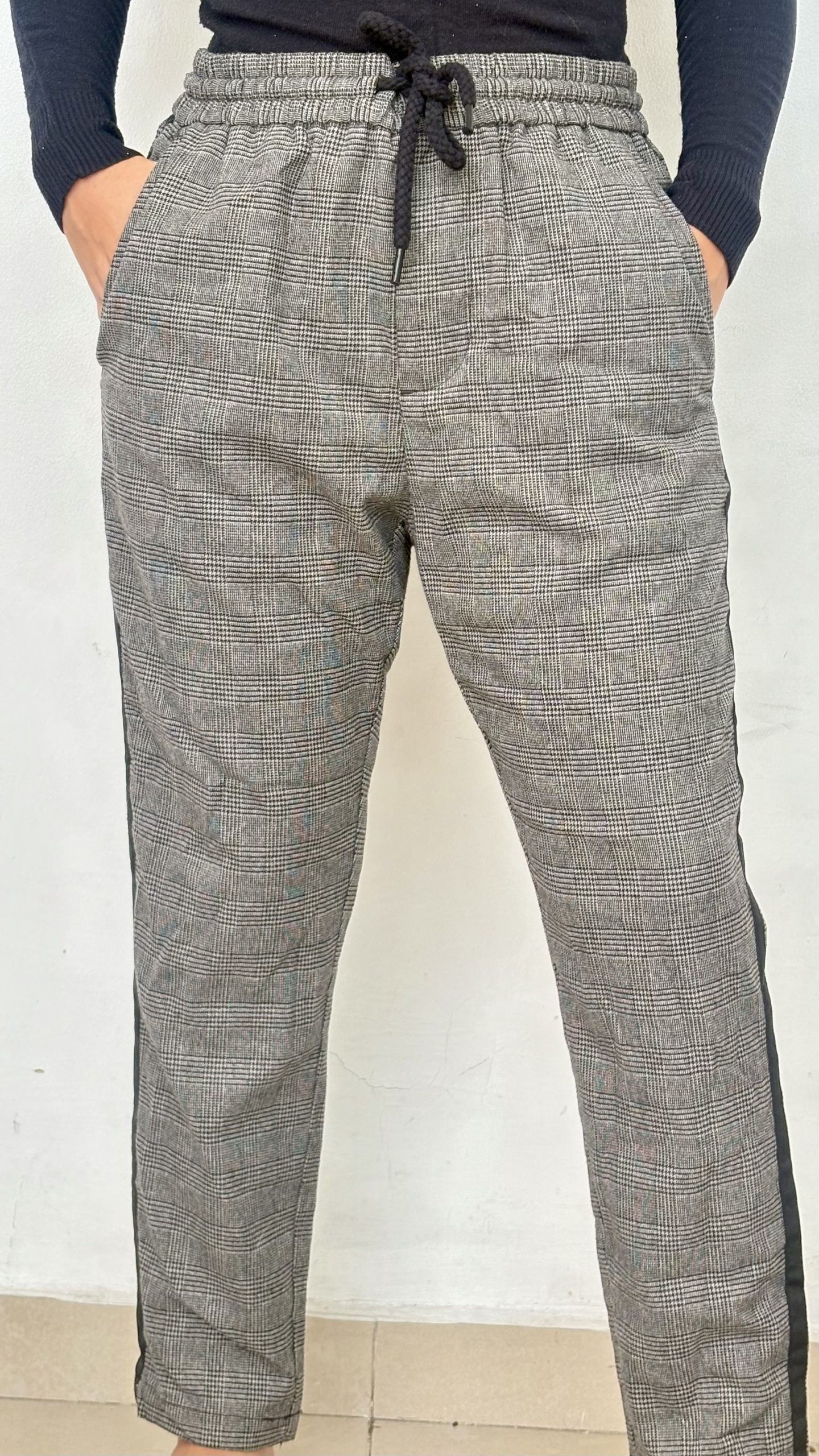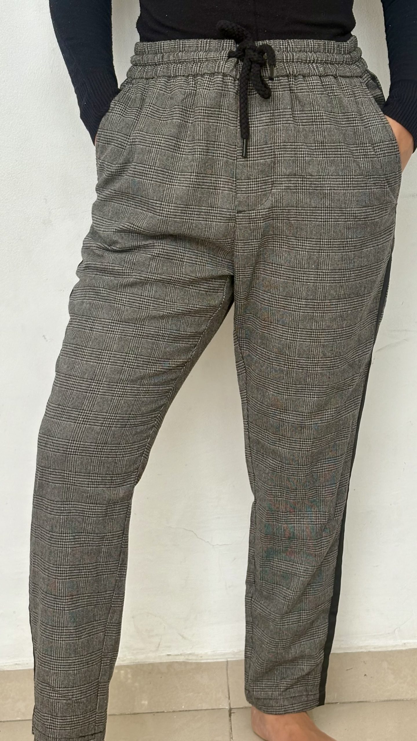 Este pantalón de tela con estampado de cuadros es la combinación perfecta entre estilo y comodidad. Su diseño con recogido en la cintura se ajusta perfectamente a la silueta, brindando un look moderno y favorecedor. Las dos líneas negras laterales añaden un toque deportivo y sofisticado, ideal para un outfit casual pero con personalidad. Perfecto para combinar con zapatillas o tacones según la ocasión.